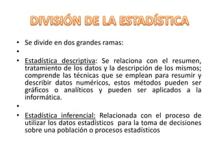 Estadística descriptiva y estadística inferencial, las cuales comprenden la estadística aplicada. La estadística se divide en dos ramas :la estadística descriptiva , la cual se relaciona con la descripción de los datos recopilados en una muestra ,y la estadística inferencial,que se relaciona con el proceso de utilizar los datos de una muestra para realizar inferencias y tomar decisiones respecto a la población. Al estudio de la muestra representativa.