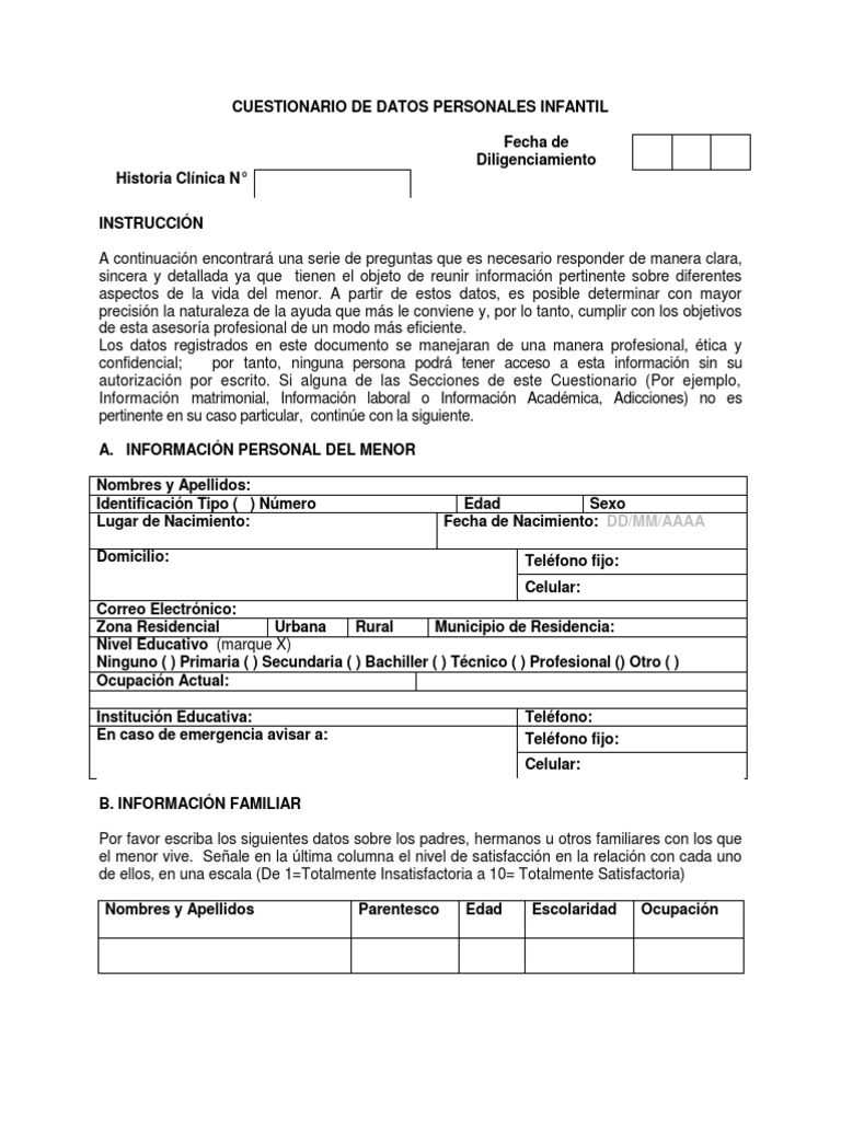 Formato Cuestionario De Datos Personales Infantil | Pdf | Cuestionario | Información