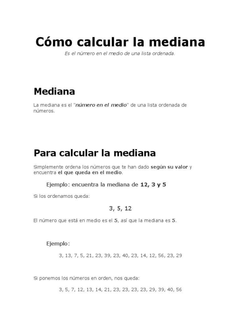 Para calcular la mediana simplemente ordena los números que te han dado según su valor y encuentra el que queda en el medio. Lo veremos bien en los ejemplos propuestos. La mediana no se debe confundir con el valor medio o el promedio.