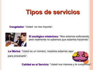 Tipos de servicio al cliente según el tipo de consumidor 1. Mantener siempre la educación e inculcarla en el personal que labora dentro de las instalaciones. Es la clasificación de tipos de servicios más utilizada y se estructura en virtud de los diferentes sectores en los que los servicios tienen cabida.