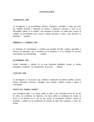 La investigación científica es un procedimiento de reflexión, control y crítica que busca aportar nuevos datos, hechos, relaciones o leyes en cualquier ámbito del conocimiento científico. La investigación científica nos ayuda a mejorar el estudio porque nos permite establecer contacto con la realidad a fin de que la conozcamos mejor, la finalidad de ésta radica en formular nuevas teorías o modificar las existentes, en incrementar los conocimientos; Definicion de investigacion diferentes autores 1.