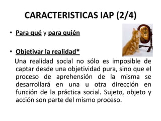 Supuestos generales de la iap. Fomenta la creación y fortalecimiento de grupos y organizaciones críticas y autónomas con capacidad de acción. Implica una participación activa y decisoria de los sujetos involucrados.